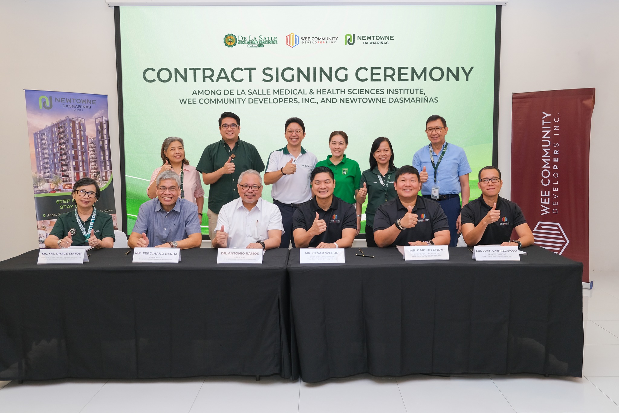 The contract signing brought together key officials from both institutions. Representing DLSMHSI were President Dr. Antonio Ramos, Chancellor Ferdinand Berba, and Strategy Management Office Director Grace Siaton. Wee Community Developers, Inc., the developer behind Newtowne Dasmariñas, sent President and CEO Cesar Wee Jr., Chief Operating Officer Carson Choa, and Project Director Gabriel Siojo.