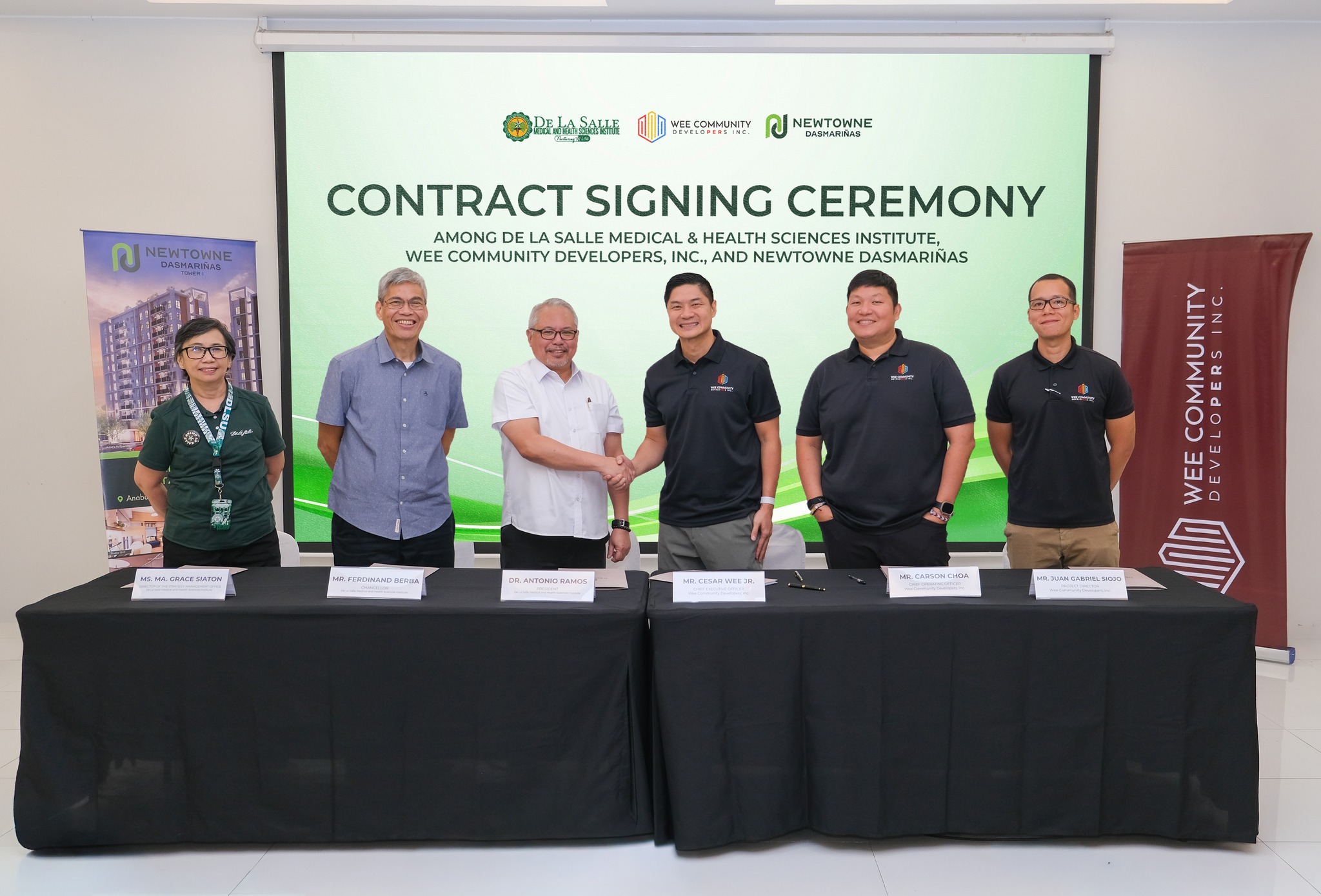 The contract signing brought together key officials from both institutions. Representing DLSMHSI were President Dr. Antonio Ramos, Chancellor Ferdinand Berba, and Strategy Management Office Director Grace Siaton. Wee Community Developers, Inc., the developer behind Newtowne Dasmariñas, sent President and CEO Cesar Wee Jr., Chief Operating Officer Carson Choa, and Project Director Gabriel Siojo.