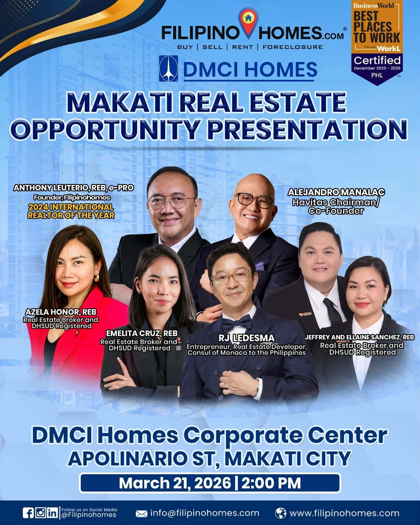 Attendees can expect an evening that feels more like a "Board of Directors" meeting than a typical seminar. The presentation will likely deep-dive into the "2026 Makati Redevelopment Plan," showcasing how transit-oriented developments and eco-sustainable condos are the new "Blue Chip" assets. Expect "insider-only" reveals of upcoming DMCI projects, aggressive rental-yield projections, and a breakdown of why Makati’s fringe areas—like Bangkal and Chino Roces—are currently the highest-performing "hidden gems" for early-entry investors. By the end of the night, you won't just have a brochure; you’ll have a strategic roadmap signed off by the biggest names in the business, giving you the "unfair advantage" needed to dominate the 2026 property market.